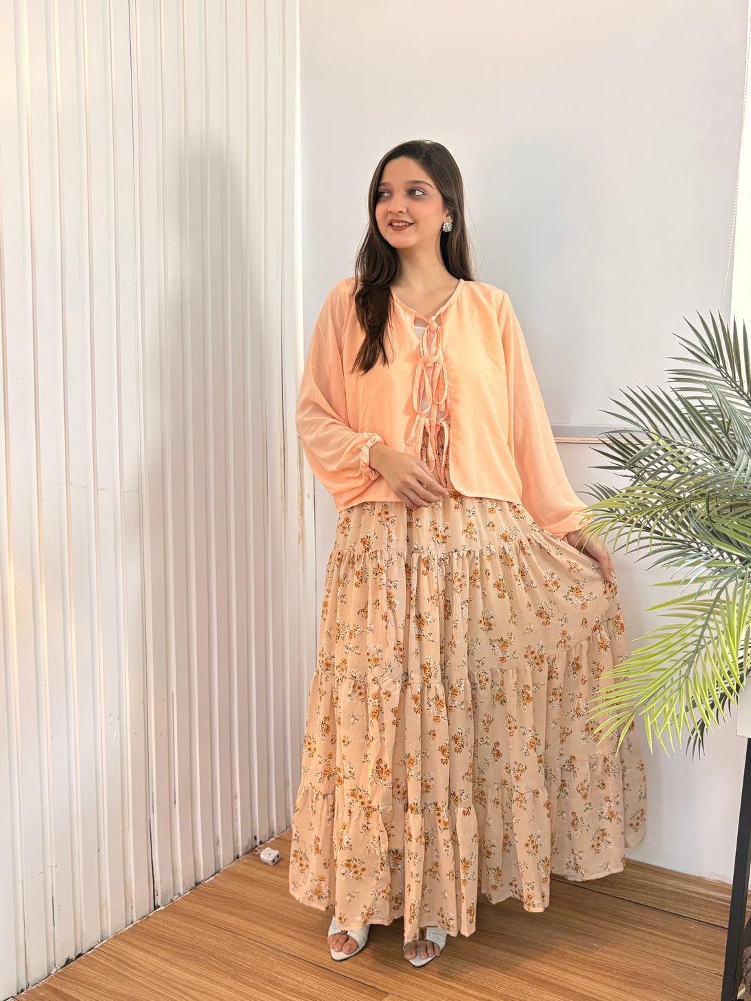 Discover understated elegance with our Beige Floral Printed tiered chiffon skirt, crafted in a soft earthy tone that blends effortlessly into any wardrobe. Designed with airy chiffon layers and a subtle inner lining, this skirt offers a graceful flow with every step while ensuring comfort and coverage. The muted olive shade adds a chic, natural touch, perfect for casual wear or elevated styling.
