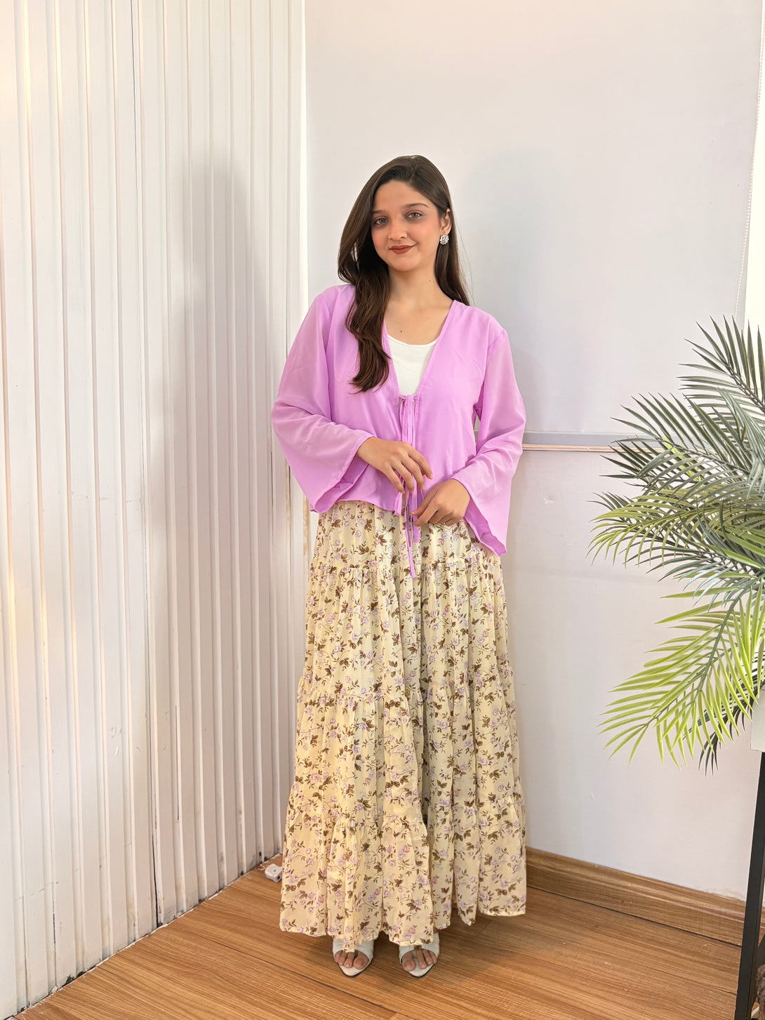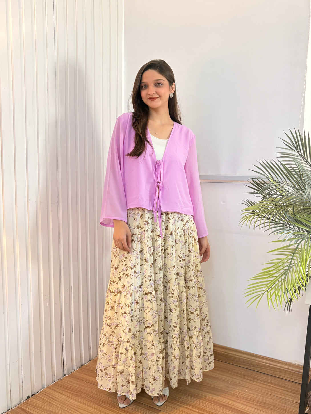 Cream Floral Printed Tiered Chiffon Skirt with Lining